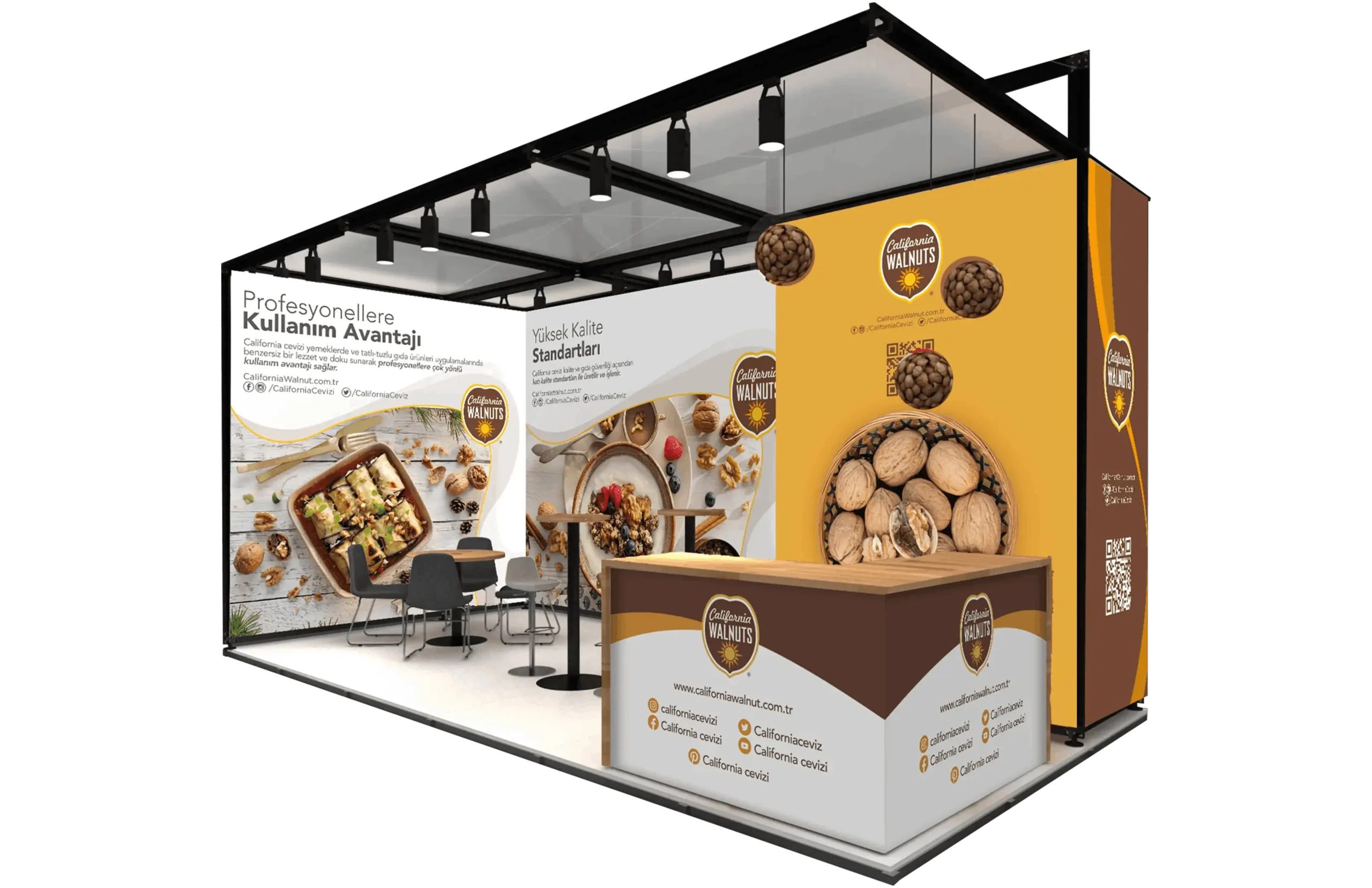 California Walnuts için markanın kimliğini ve ürünlerini en iyi şekilde yansıtan, dikkat çekici bir fuar standı tasarladık. Fonksiyonel ve estetik detayları bir araya getirerek ziyaretçilerin etkileşimini artıran bir alan oluşturduk.